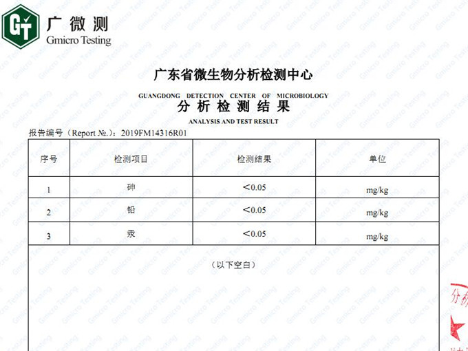 我司研發的植物精油甲醛凈產品不同于市場上傳統的光觸媒產品,除了在施工過程中不需要光照外,在除甲醛效果上遠遠優于傳統光觸媒產品。此次送檢的樣品批次為9月份新產,經過廣微測的嚴格無毒檢測證明,所有重金屬和有毒成分含量幾乎為零。也就是說甲醛凈為無毒安全產品。以下為檢測報告截圖: